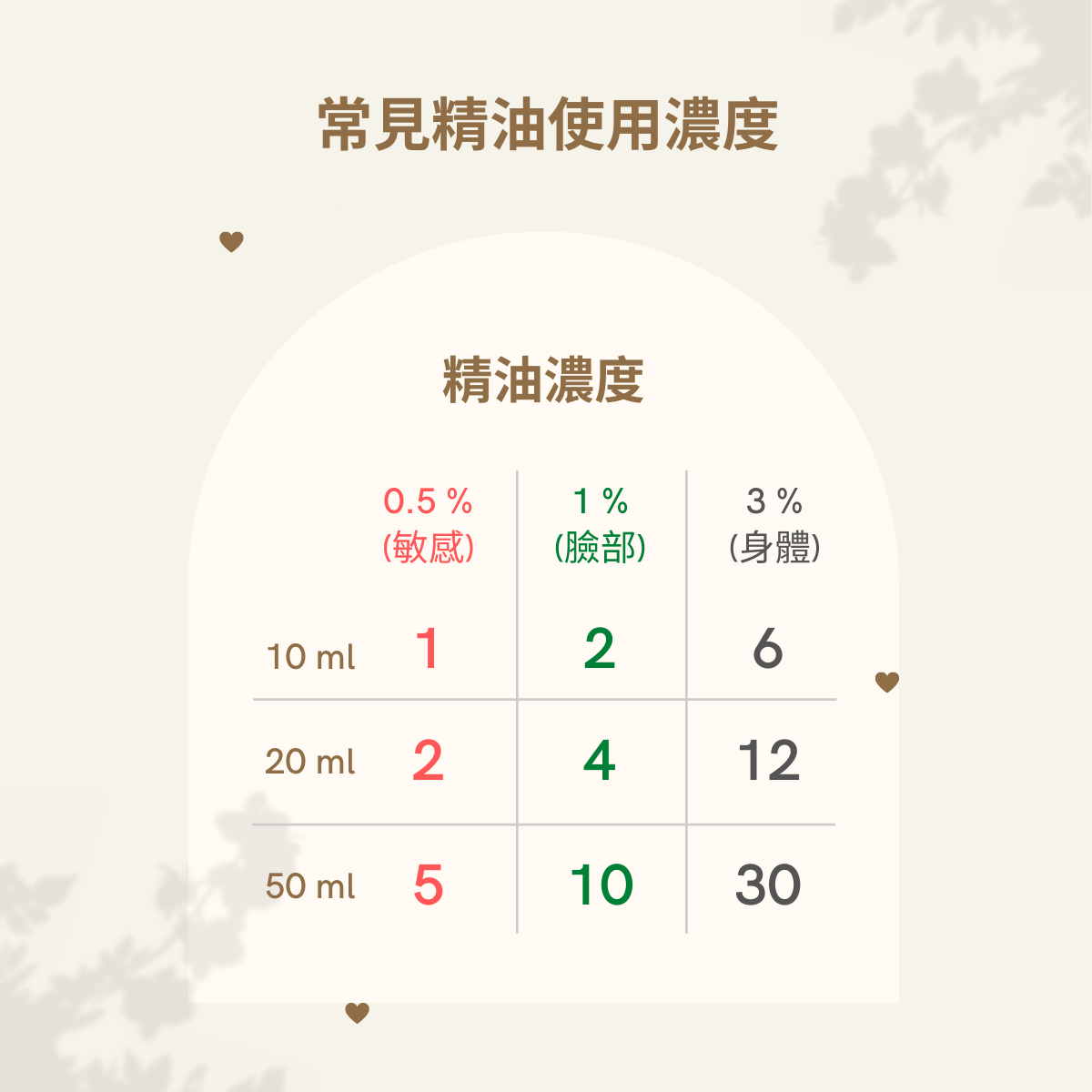 身體適合的濃度會依照使用者的『膚質狀況』、『年齡』、『使用部位』以及『使用的精油品項』而有所不同,一般正常膚質狀況的成年人用於身體四肢建議使用1-3%,臉部建議0.1-2%。